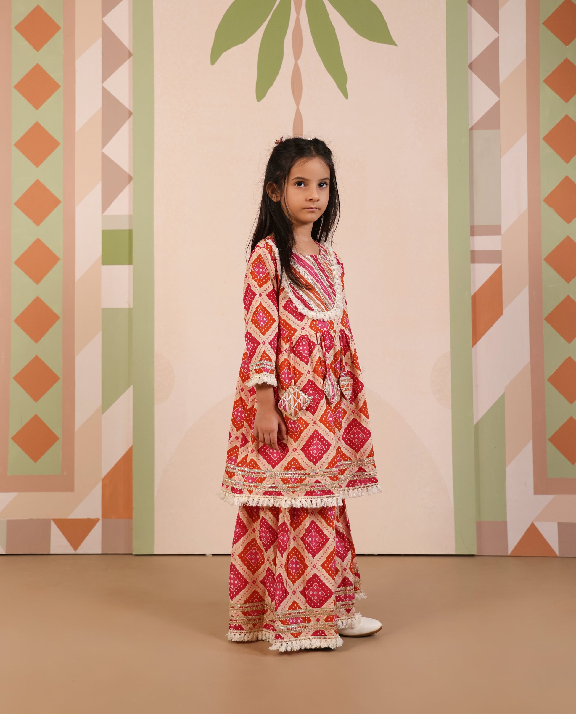 This is a vibrant cotton ethnic set for girls, featuring a long kurta with an all-over traditional bandhani-style print in pink, orange, and cream tones. It’s paired with matching wide palazzo pants Sharara . The outfit is highlighted with delicate lace trims and golden detailing at the edges, giving it a festive yet comfortable look—perfect for casual celebrations, family gatherings, or festive