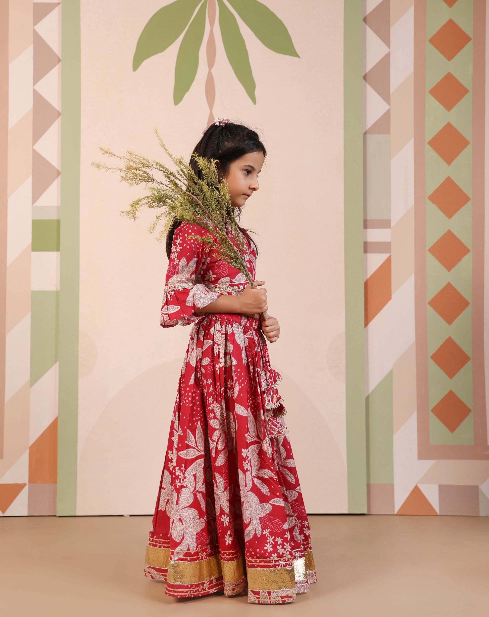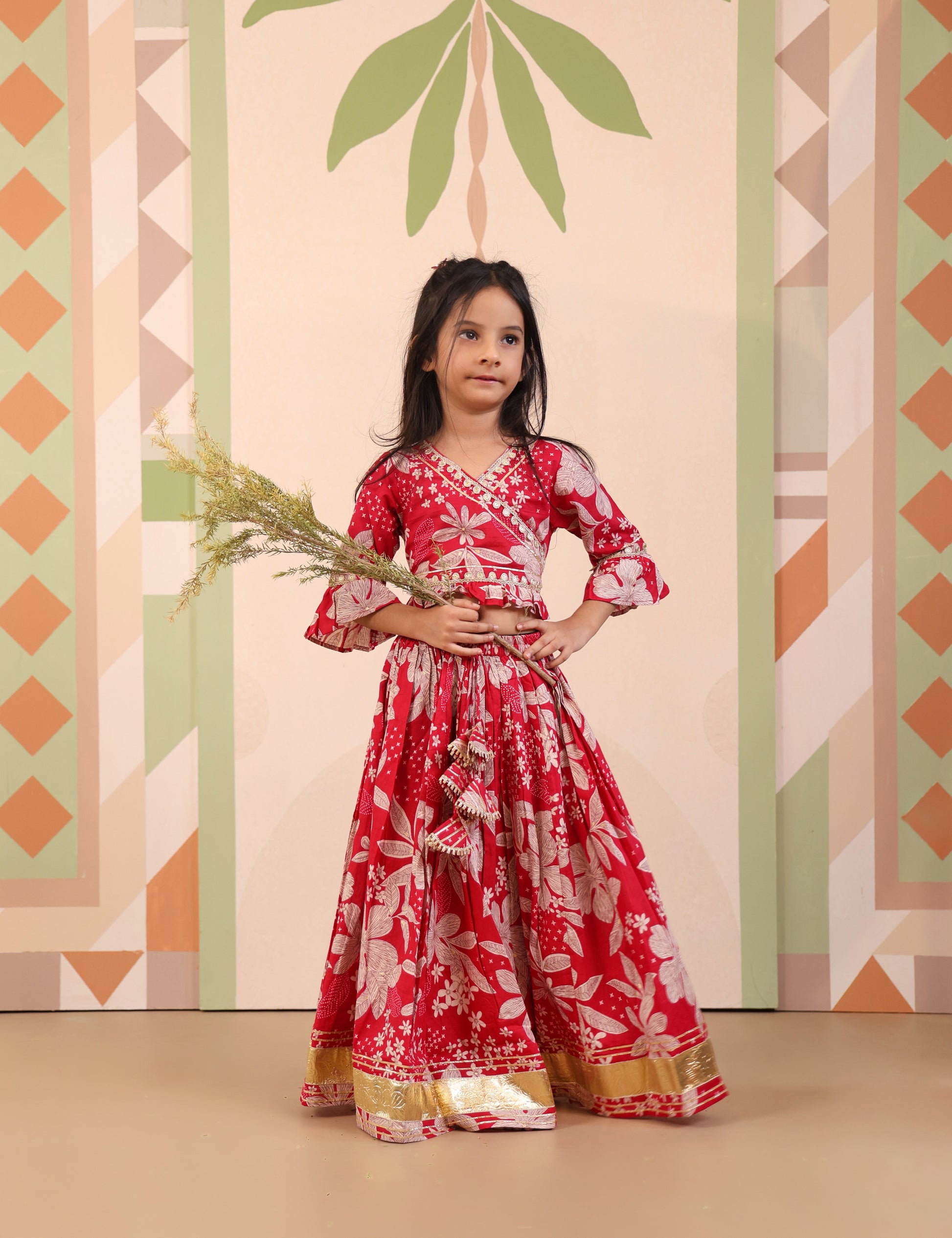 This is a traditional-style kids’ outfit consisting of a floral printed lehenga (skirt) paired with a matching wrap-style blouse with flared sleeves. The lehenga has a broad golden border at the hem and decorative tassels at the waist, giving it a festive and elegant look. It’s perfect for weddings, festivals, or traditional occasions.
